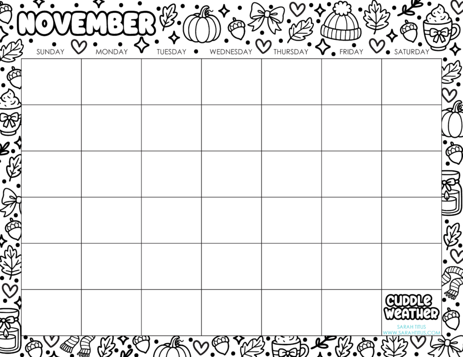 Today, you can have a free printable November calendar coloring page, perfect for all your blog posts, life stuff, or anything else you’d like to use it for.
